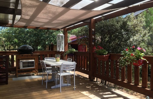 for 2-4 persons: kitchen living room, bedroom double bed 140, bedroom 2 bunk beds of 90, living room, bathroom toilet, large terrace, flower garden and trees