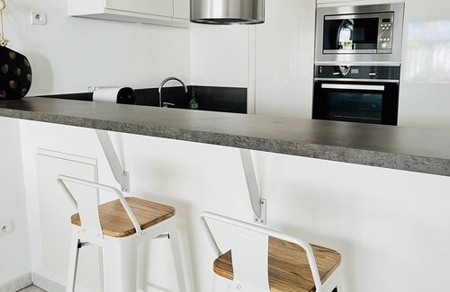 -Fully equipped kitchen with oven, microwave, dishwasher, induction hob, coffee machine, toaster, kettle.
