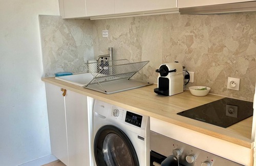 A fully equipped kitchen: oven, induction cooktop, microwave, Nespresso coffee machine, washer-dryer