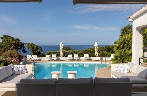 Outdoors, the spacious terraces and lounges overlook the sea, pool, and garden, offering breathtaking views and the perfect setting for peaceful relaxation.